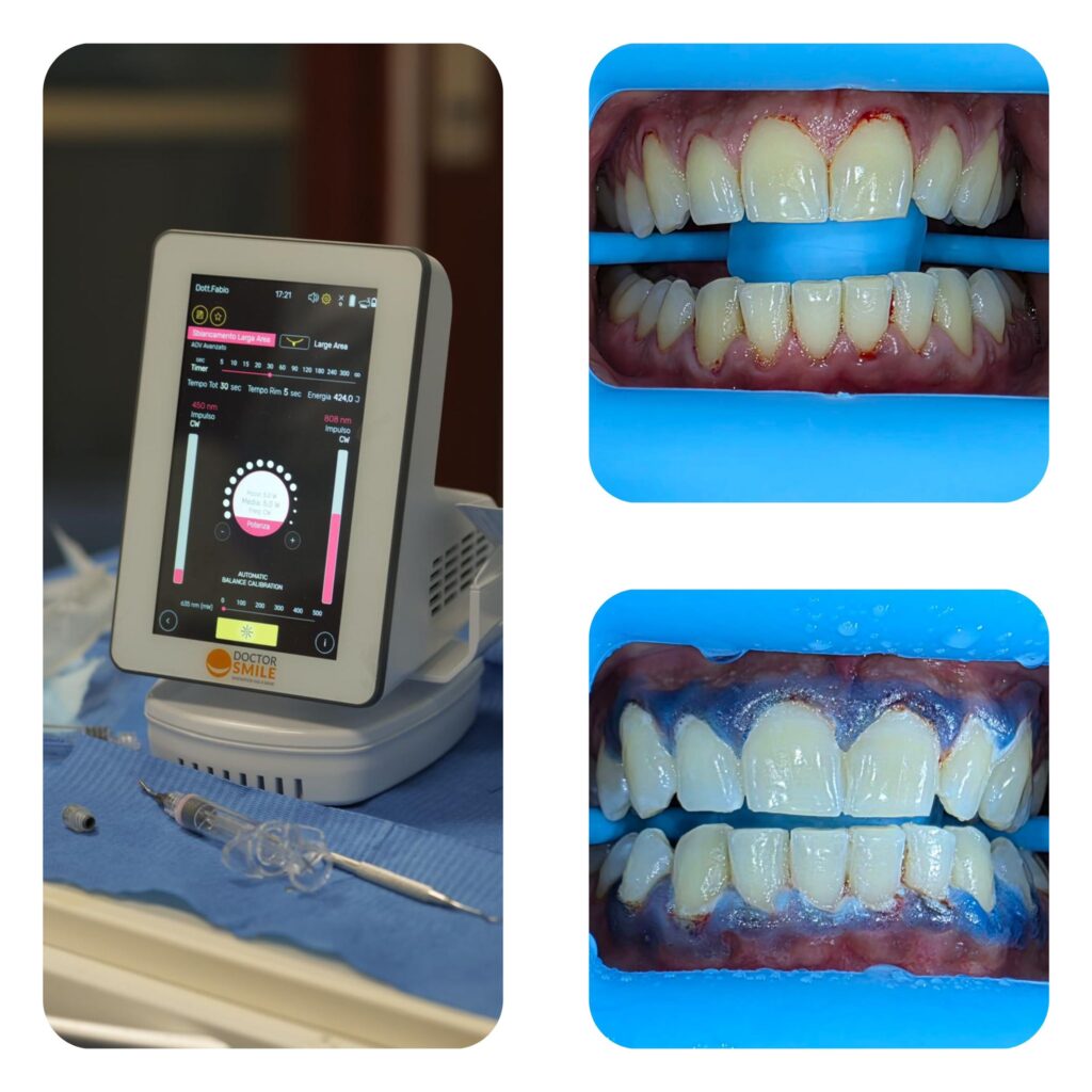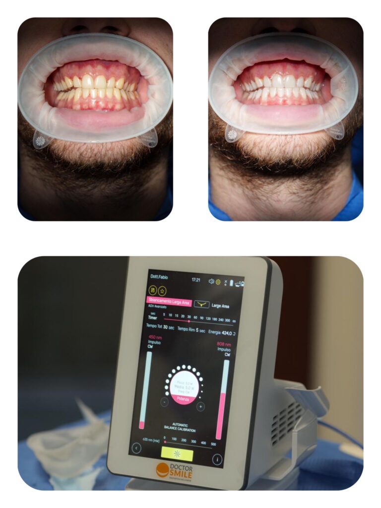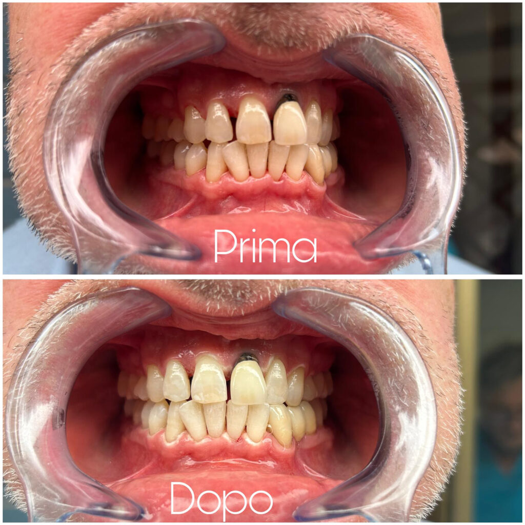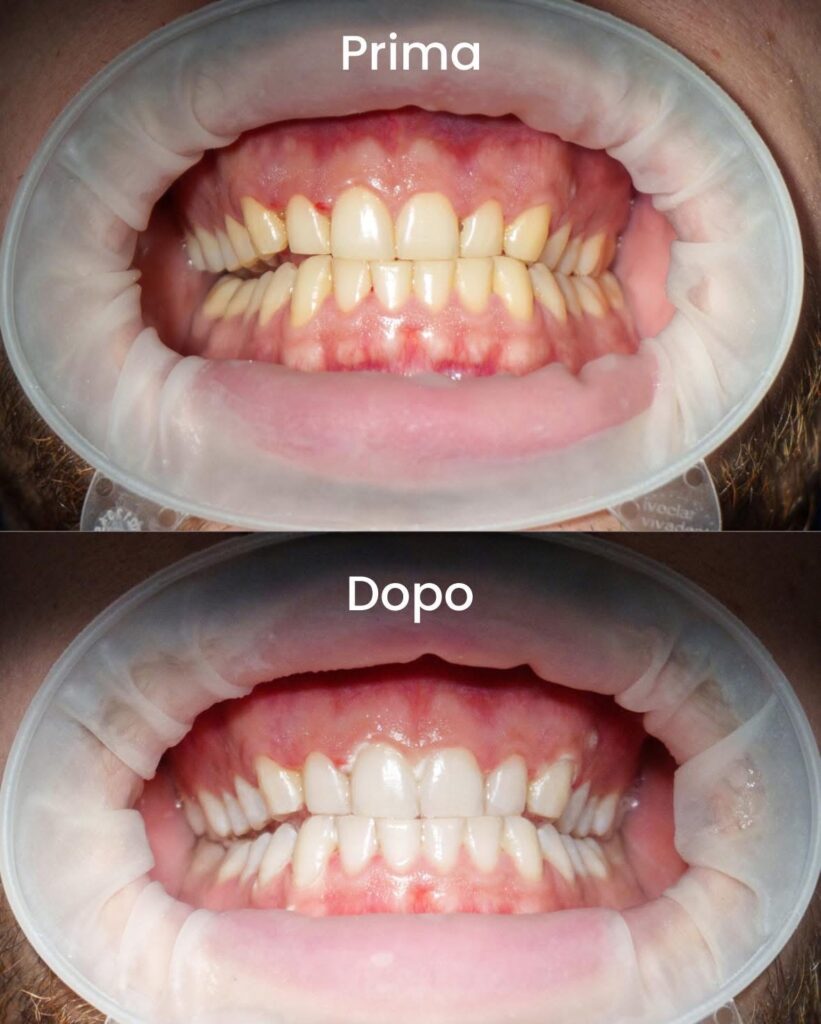 Prima e dopo un trattamento di sbiancamento dentale: un cambiamento visibile che valorizza il tuo sorriso.